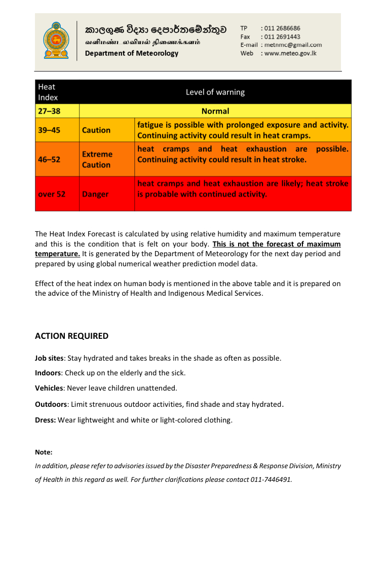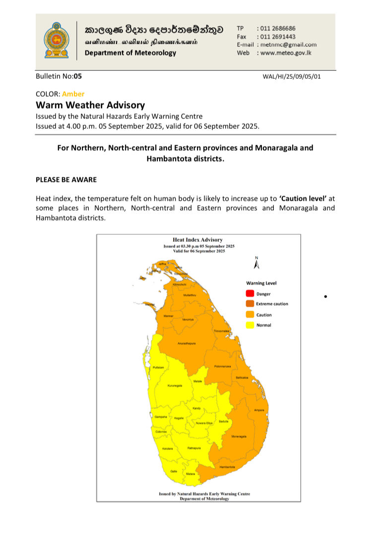 The heat index, or the temperature felt on the human body, is expected to reach ‘Caution’ levels in parts of the Northern, North-Central, and Eastern provinces, as well as in Monaragala and Hambantota districts.