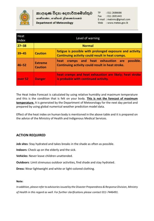 The Department of Meteorology has issued an advisory for warm weather for the Western, Sabaragamuwa, Southern and North-western provinces and Monaragala and Mannar districts.