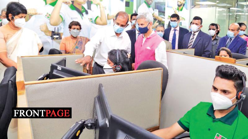 Visiting Indian Foreign Affairs Minister Dr. S. Jaishankar visited the 1990 Suwaseriya Pre- Hospital Ambulance Service Call Centre at Rajagiriya yesterday. Suwaseriya Foundation Chairman Dumindra Rathnayake explaining the functions at the centre. State Minister Dr. Sudharshani Fernandopulle and officials look on.