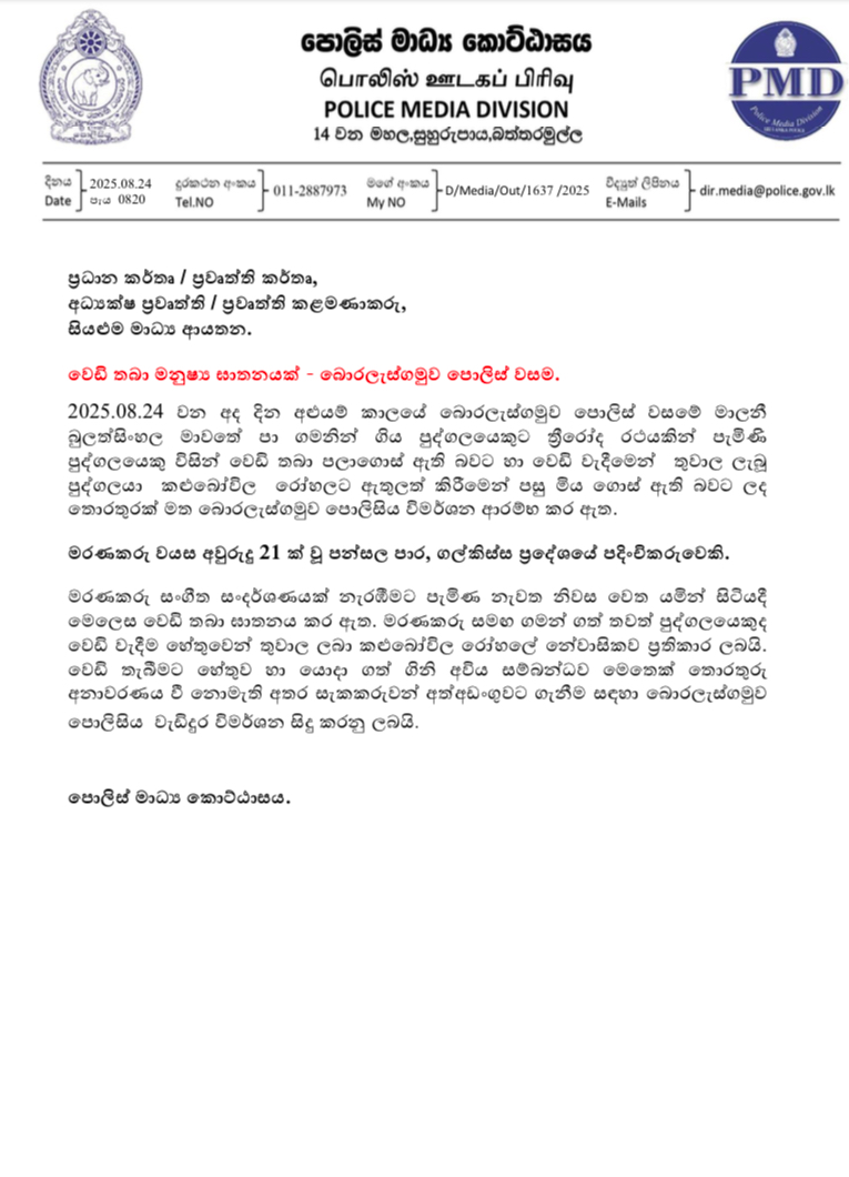 Another individual who was with the victim was also injured and is receiving treatment at the same hospital. The motive and weapon used are yet to be identified, while Boralesgamuwa Police have launched further investigations to arrest the suspects.