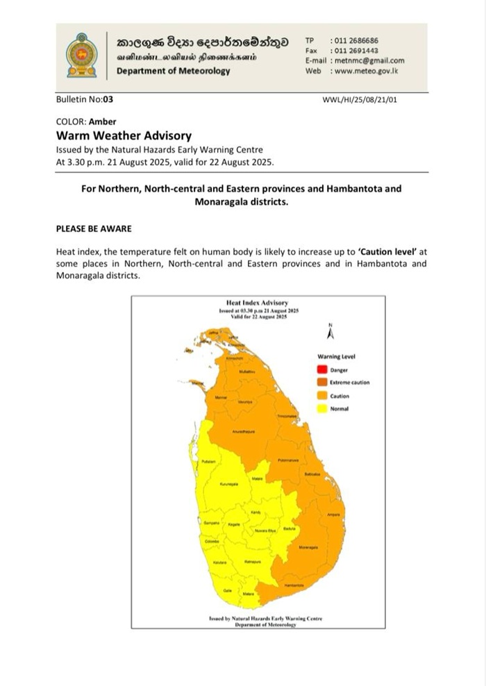 The Department of Meteorology has issued an advisory for warm weather for the Northern, North-central and Eastern provinces and Hambantota and Monaragala districts.