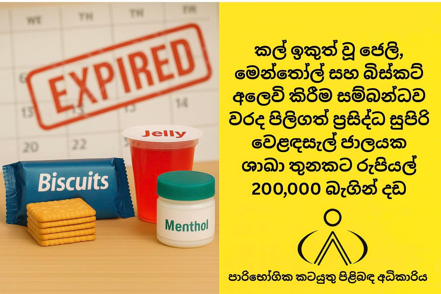 Three branches of a leading supermarket chain have each been fined Rs. 200,000 by the Aluthkade No. 5 Magistrate’s Court for offering expired jelly, menthol, and biscuits for sale.