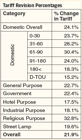 Accordingly, the overall tariff deduction of the Domestic Purpose category will be 24.1 percent, while the overall tariff deduction of the General Purpose category will be 22.7 percent. Meanwhile, the overall tariff deduction of the Government category will be 22.4 percent, whilst the overall tariff deduction of the Hotel category will be 17.5 percent.