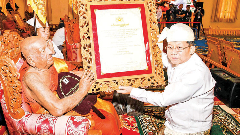 The Senior General offered Abhidhaja Maha Rattha Guru title and insignia to Most Venerable Prof. Kumburugamuwe Vajira Thera from Sri Lanka, Somdet Phramahathirachan from Thailand and Shweminwun Sasana Yeiktha Sayadaw of Bahan Township Agga Maha Kammathanacariya Bhaddanta Sobhana on behalf of Mahasi Sayadaw Bhaddanta Sobhana.