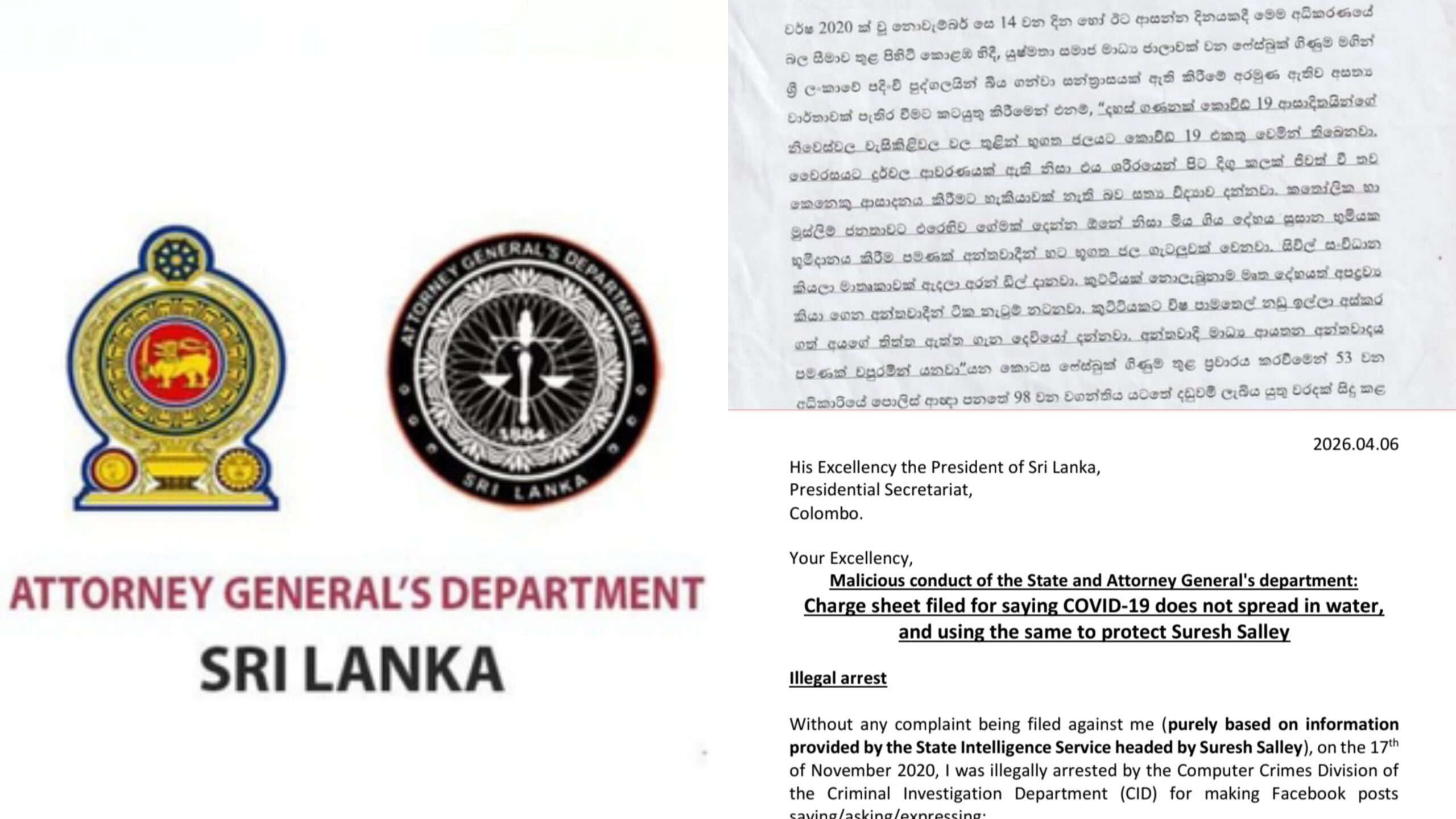 In a letter dated April 6, Chirantha Amerasinghe said he was arrested in November 2020 by the CID without a complaint, based on information from the State Intelligence Service headed by former intelligence chief Suresh Sallay, after making social media posts questioning the Easter attacks and opposing forced cremations.