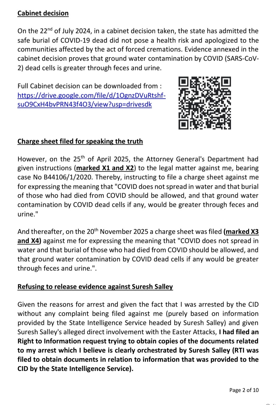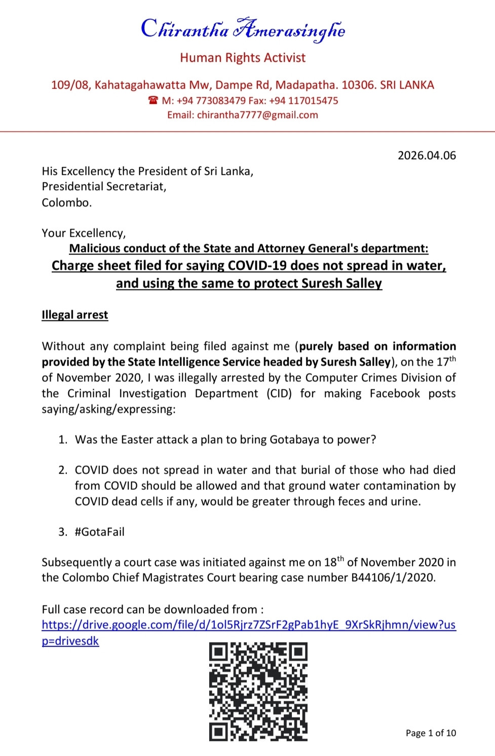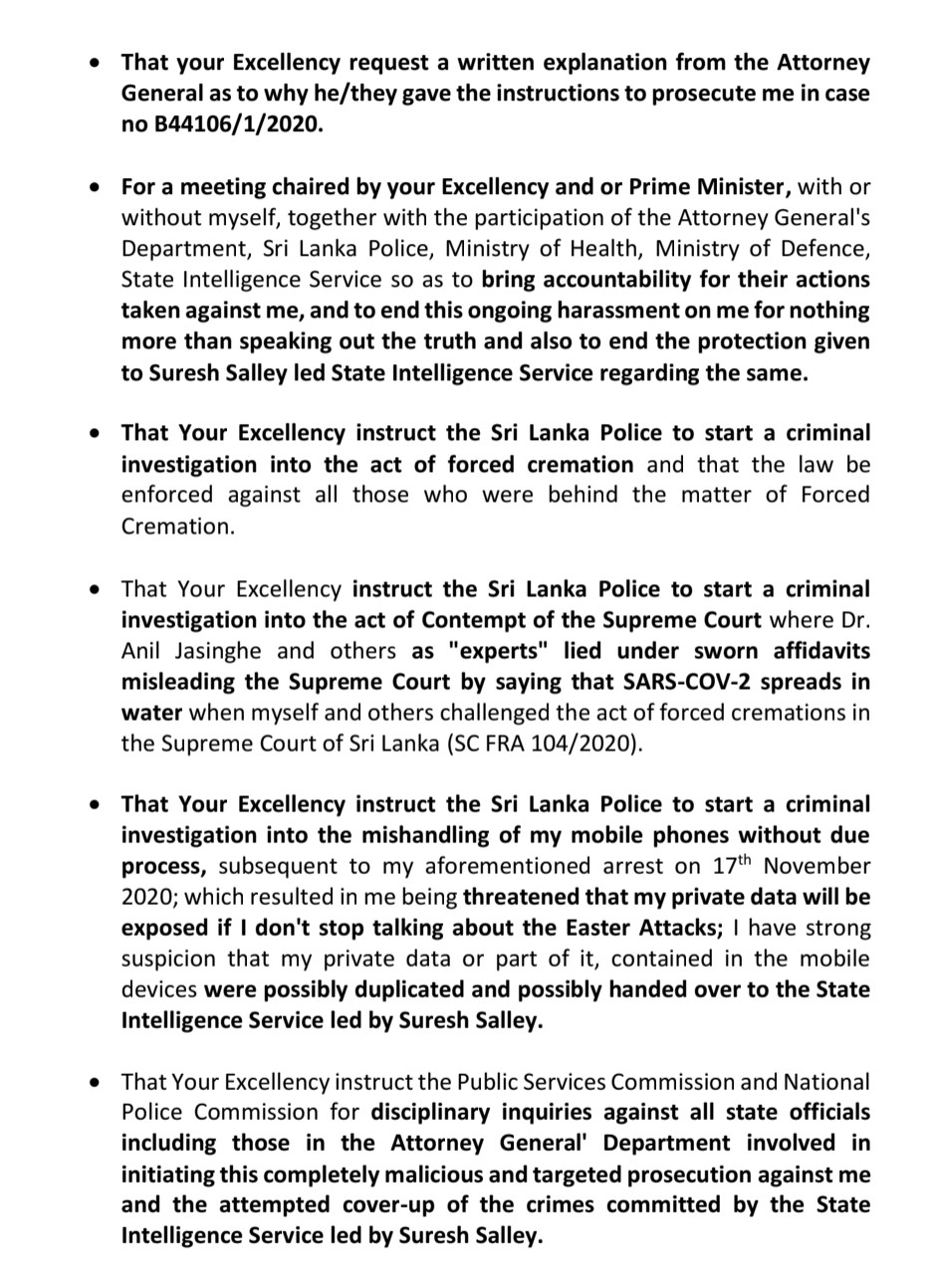 According to the letter, Amerasinghe had stated that COVID-19 does not spread in water and that burial of those who died from COVID should be allowed, while also claiming the forced cremation policy was implemented despite scientific evidence saying burial was safe and aimed at hurting Muslim and Christian communities.