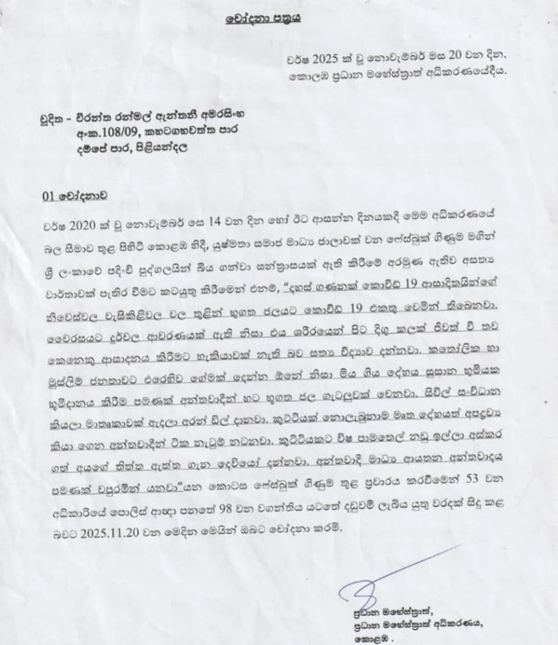 According to the charge sheet, Amerasinghe has been accused of attempting to create panic among Sri Lankans by publishing false information on Facebook regarding COVID-19 and burial practices.