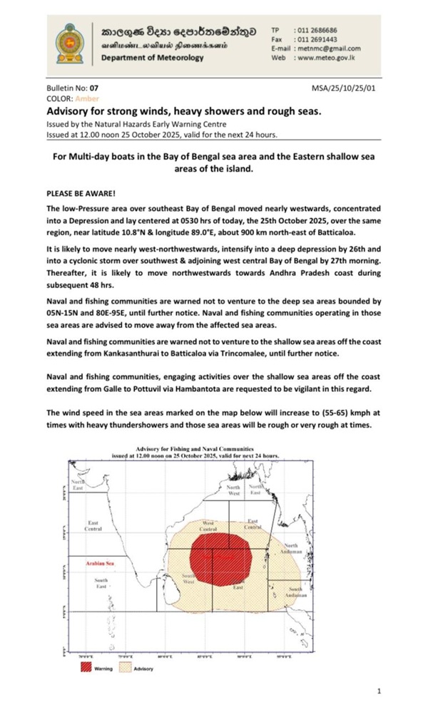 The Department of Meteorology has issued an advisory for strong winds, heavy showers and rough seas for multi-day boats in the Bay of Bengal sea area and the Eastern shallow sea areas of the island, valid for the next 24 hours starting at 12.00 pm today.