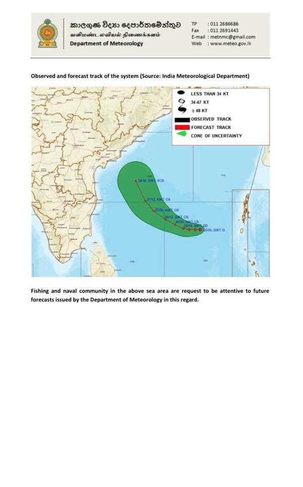 According to the Department, the low-pressure area over the southeast Bay of Bengal, which has moved nearly westwards, has concentrated into a Depression and lies centred at 0530 hrs of today (25), over the same region, near latitude 10.8°N & longitude 89.0°E, about 900 km north-east of Batticaloa.
