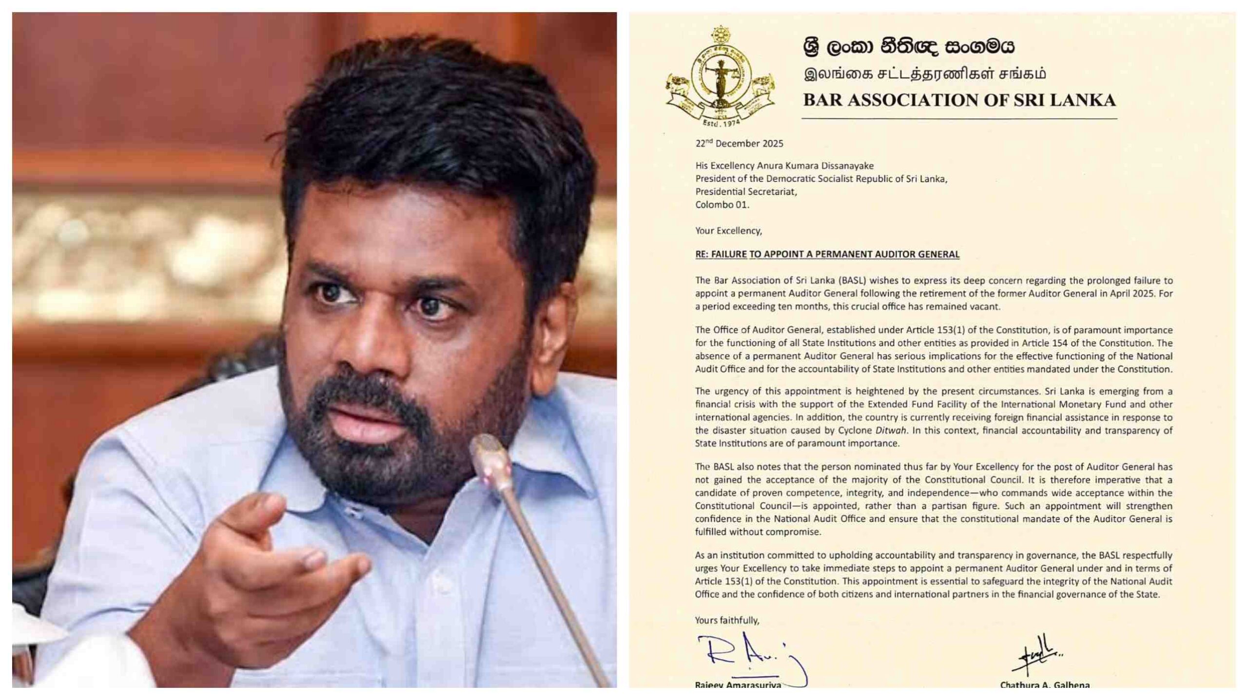 The Bar Association of Sri Lanka (BASL) has written to President Anura Kumara Dissanayake expressing concern over the prolonged failure to appoint a permanent Auditor General since April 2025.
