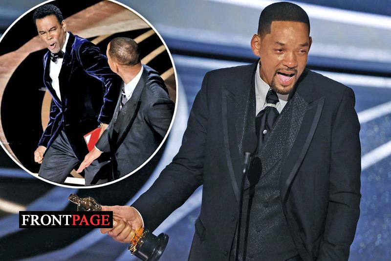 An emotional Will Smith with his Best Actor Oscar at the 2022 Academy Awards.(Inset) Will smith punching Chris Rock (L) in a dramatic on-stage scene.