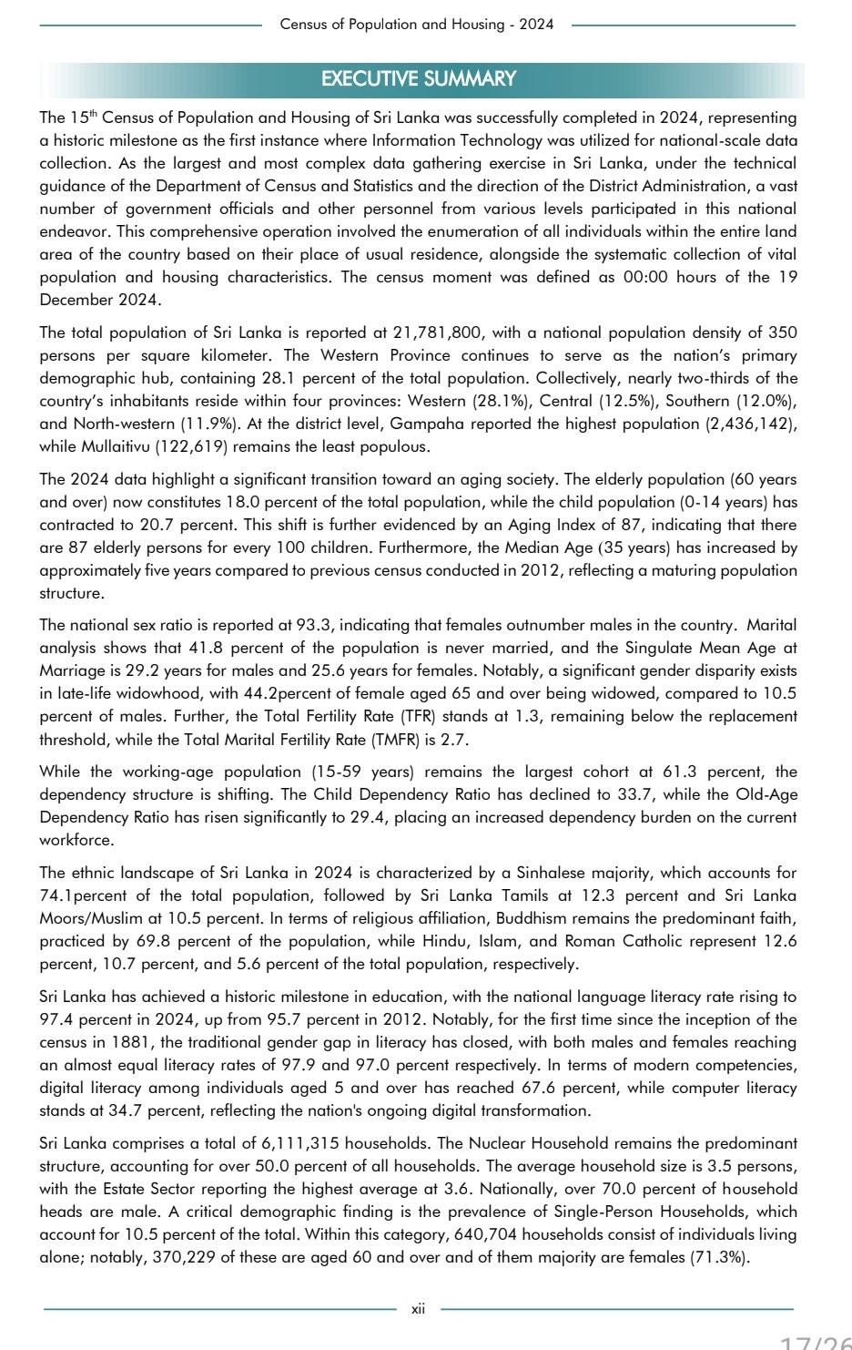 Sri Lanka’s population has reached 21.78 million, with the country rapidly ageing, literacy improving, and migration patterns shifting, according to the Final Report of the 2024 Census of Population and Housing released by the Department of Census and Statistics.