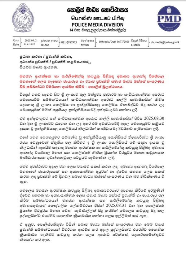 The Criminal Investigation Department (CID) has launched a probe into a doctored image falsely attributed to Minister of Public Security Ananda Wijepala that was circulated on social media.