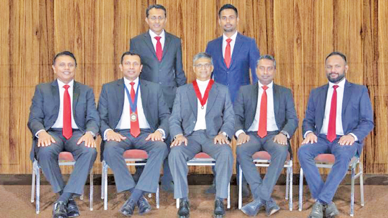 AIMG Secretary Roshan Kaluarchchi, AIMG Chairman Kanchana Karunagama, AIGM President Deepal Sooriyarchchi, Former Chairman Sujith Silva, Treasurer Anuradha Edirisinghe, together with Charaka Perera and Sumudu Thanthrige.