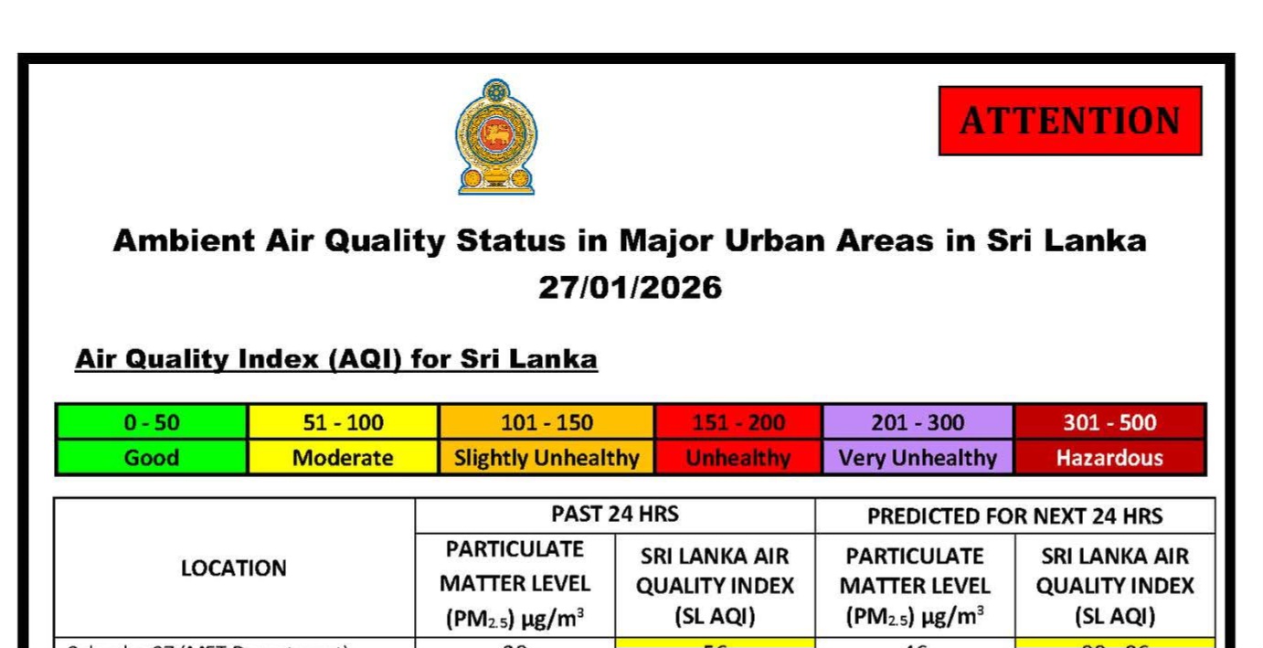 However, forecasts for the next 24 hours indicate that air quality could range between moderate and slightly unhealthy levels in several cities, including Jaffna and Puttalam. The agency warned that polluted winds from the northern region under transboundary conditions could push air quality to slightly unhealthy levels across the country for the next two to three days.