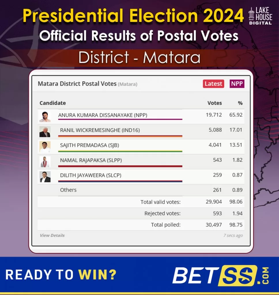 AKD wins Matara, Nuwara-Eliya District postal votes Politics On Sep 21, 2024 FB IMG 1726953604239 968x1024 1 0 0 Share NPP presidential candidate Anura Kumara Dissanayake secured victory in the postal voting of Matara and Nuwara-Eliya Districts. The post AKD wins Matara, Nuwara-Eliya District postal votes appeared first on DailyNews. 0 0 Share FacebookTwitterGoogle+ReddItWhatsAppPinterestEmail