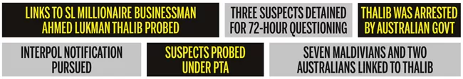 In addition to the Sri Lankans who had relations with him, Interpol has uncovered facts regarding seven Maldivian nationals and two Australian nationals who maintained ties with Thalib. It was revealed in the court that Thalib has also worked as the main partner of a Sri Lanka-based gem company, while providing finances to Al-Qaeda. The United States of America imposed sanctions on him in 2020, accusing him of providing financial support to Al-Qaeda.