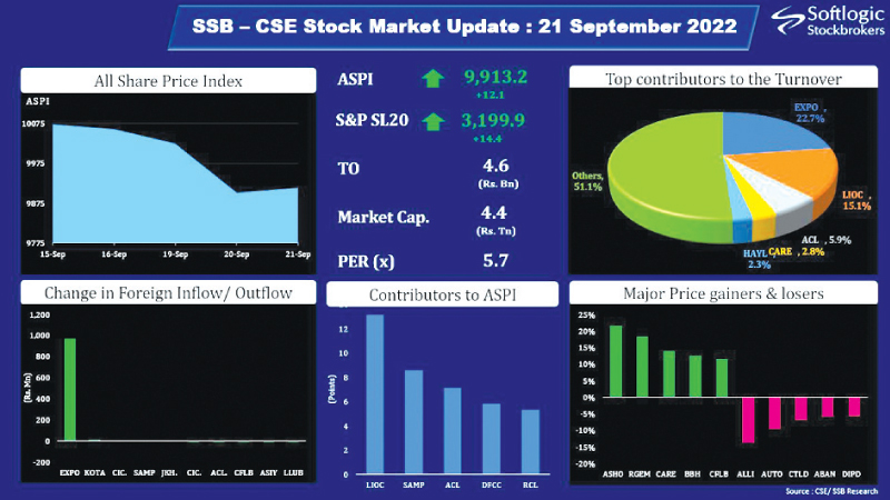 Thus, All-Share Price Index increased by 12.1 points (+0.1%) to close at 9,913.2 for the day whilst S&P SL20 Index also increased by 14.4 points (+0.5%) to close at 3,199.9. Lanka IOC, Sampath Bank, ACL Cables, DFCC Bank, Lanka IOC and Aitken Spence and Royal Ceramics remained as the top positive contributors to the ASPI during the day.
