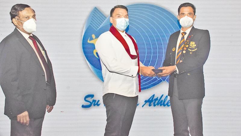 W.K.A.S. Priyanthalal who obtained highest marks at the World Athletics Technical officials Education and Certification System (TOECS) Level one course receiving special award from Sports Minister Namal Rajapaksa at the Sri Lanka Athletics centenary celebrations launching ceremony held at Grand Monarch, Thalawathugoda last Wednesday .