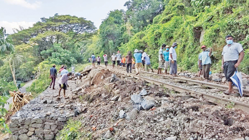 Train services between Colombo Fort and Kandy were disrupted due to minor landslides in several area between Rambukkana and Kandy following the heavy downpour experienced in the Central parts of the country for several weeks. Sri Lanka Railway employees restoring the damaged rail track from Rambukkana to Balana. Picture by Wimal Karunatillake.