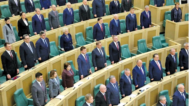 A view of the Federation Council of the Federal Assembly of the Russian Federation stand for the national anthem during a session in Moscow, Russia on Tuesday. Lawmakers gave Russian President Vladimir Putin permission to use military force outside the country.