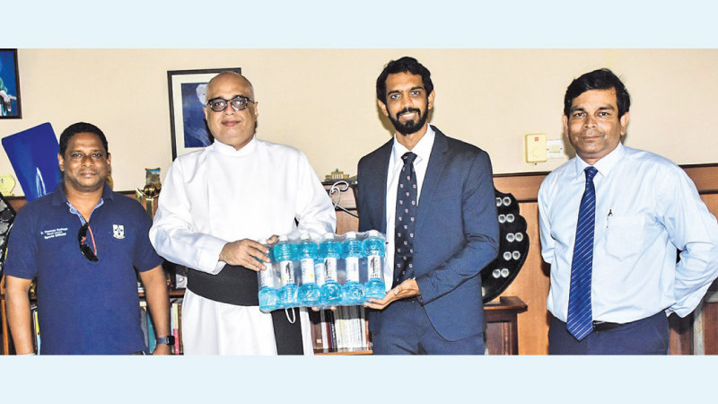 Warden, S. Thomas’ Rev. Fr. Marc Billimoria (second from left) receiving a pack of Yeti products from Dr. Dilshan Balasuriya (Director, Yeti) in the presence of Sports Director, S. Thomas’ Dinesh Kumarasinghe (left) and Malik Perera (CEO, Yeti).