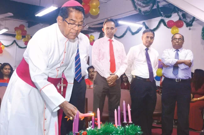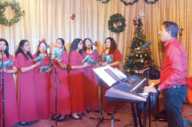The annual Christmas Carols organized by Lake House Catholic Solidarity was held in the Company premises yesterday under the patronage of Auxiliary Bishop of Colombo Rt. Rev. Dr. Maxwell Silva. Lake House Chairman Professor Harendra Kariyawasam received the Bishop at the entrance. Picture shows the Lake House staffers performing at the Christmas Carols. Senior Management of the Company and members of the Lake House Catholic Solidarity were present.