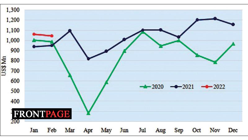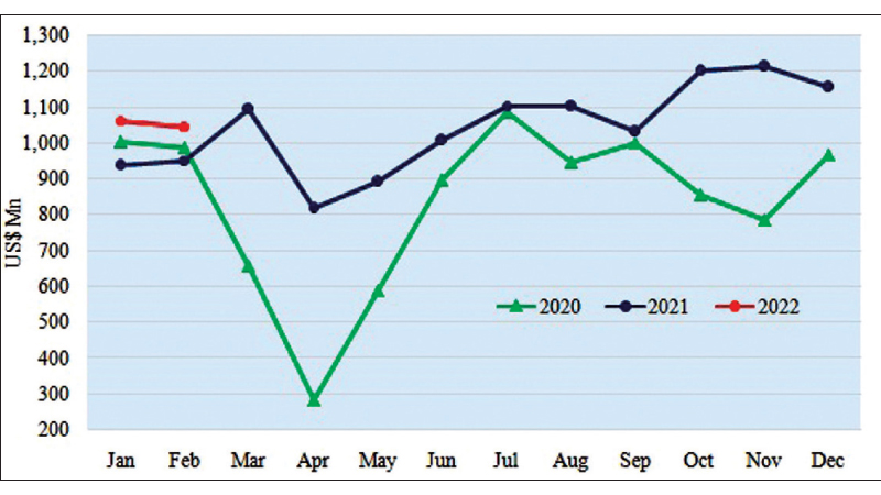 Sri Lanka’s merchandise exports increased by 9.91% to US$ 1,046 million in February 2022 compared to February 2021 as per the data released by the Sri Lanka Customs and this is a 5.8% increase when compared to February 2020.