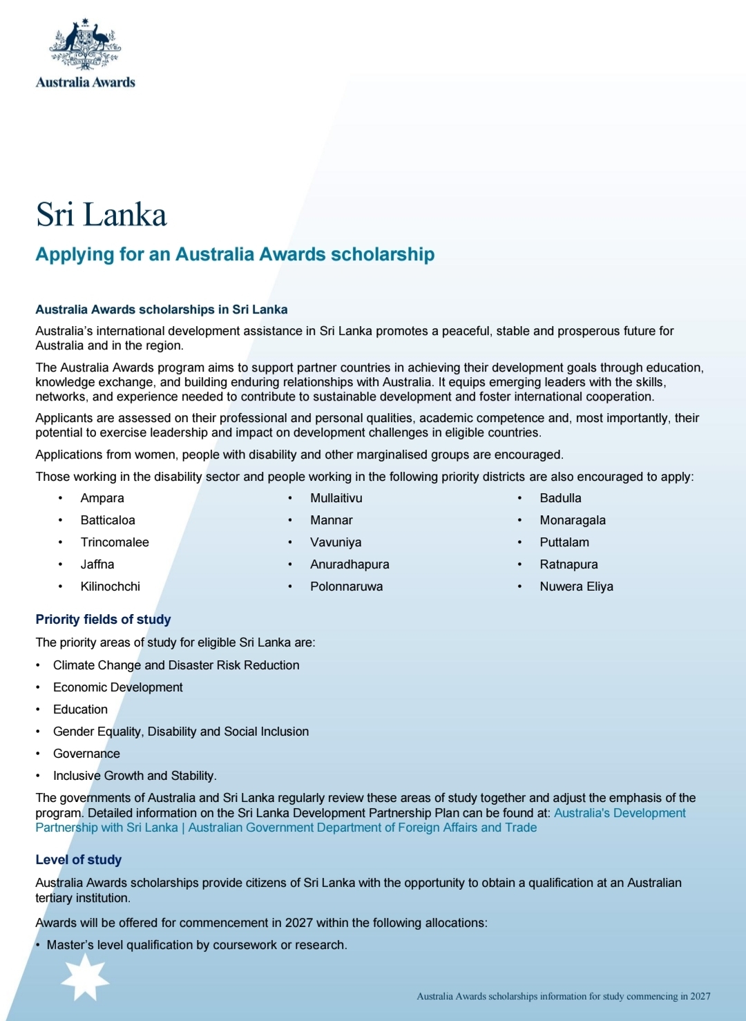 Under the 2027 intake, scholarships will be awarded for Master’s degree programmes by coursework or research at Australian tertiary institutions. Priority fields of study include climate change and disaster risk reduction, economic development, education, governance, gender equality, disability and social inclusion, as well as inclusive growth and stability .