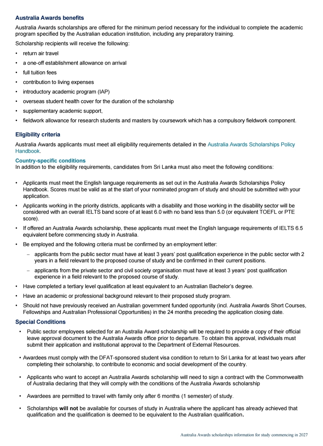 Eligible applicants must be Sri Lankan citizens with at least three years of post-qualification work experience in a field relevant to their proposed course of study. Candidates must also meet English language requirements and hold a qualification equivalent to an Australian bachelor’s degree.
