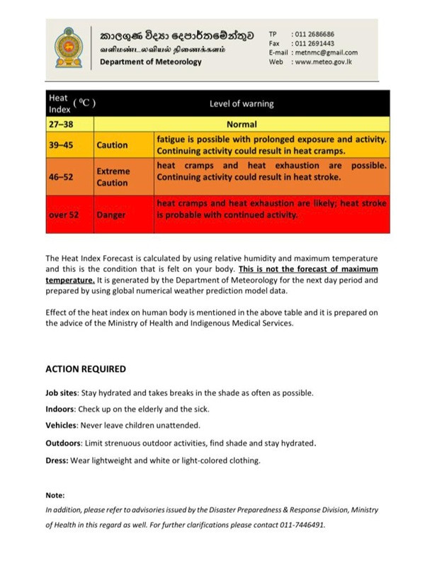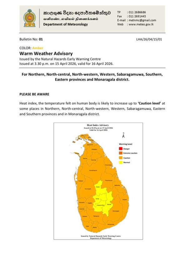 The Department of Meteorology has issued an advisory for warm weather in the Northern, North-central, North-western, Western, Sabaragamuwa, Southern, Eastern provinces and the Monaragala district.