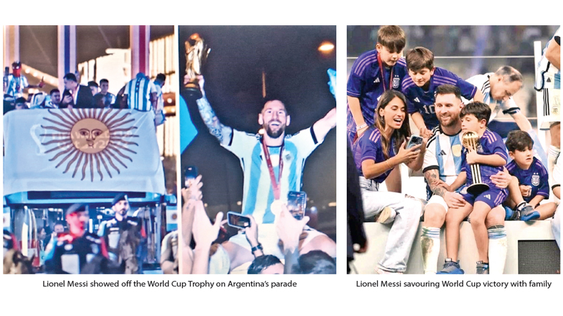 Fireworks and music blasted out as Skipper Lionel Messi and his teammates celebrated on a slow cruise past joyous, screaming fans in Lusail, Doha, Qatar.