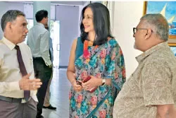 Foreign Secretary Aruni Wijewardena  in conversation with High Commissioner of Maldives Masood Imad. Picture by Hussain Farook