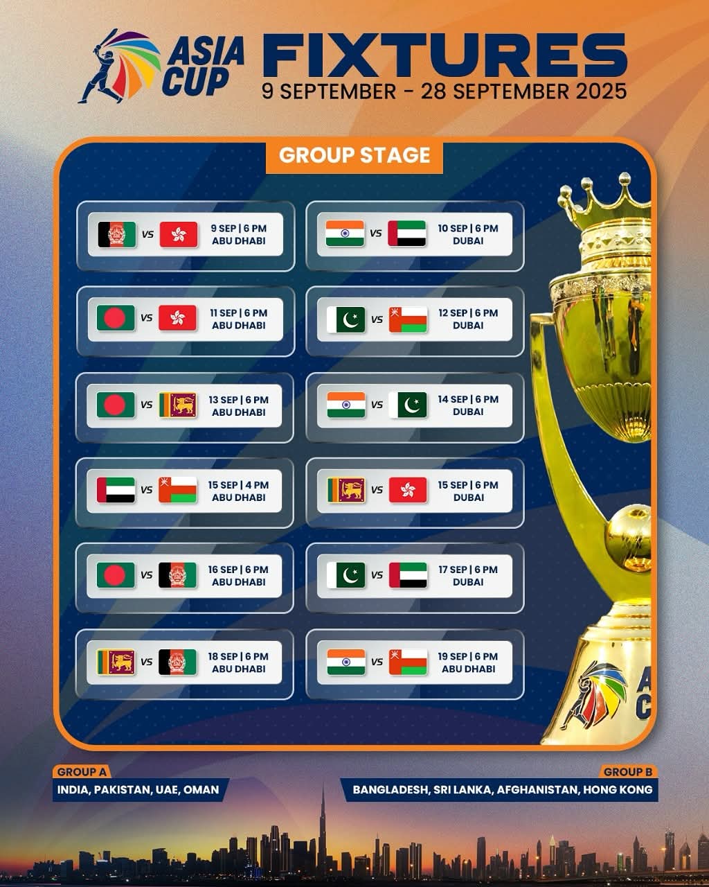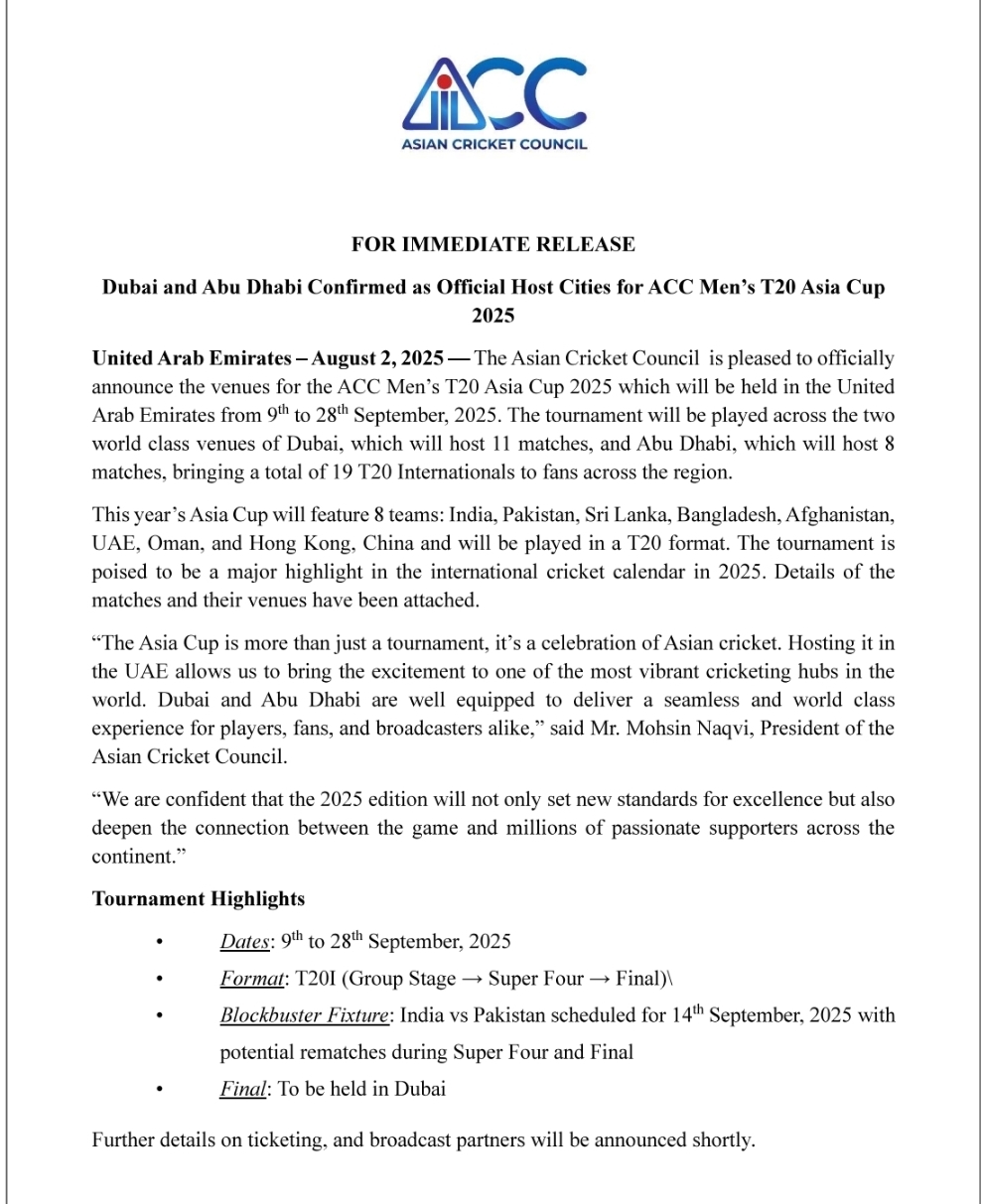 The post Asia Cup 2025 schedule announced with venues appeared first on Newswire.