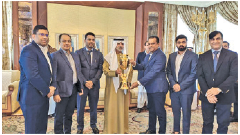 The President of Sri Lanka Cricket Shammi Silva (third from right) and the President of the Emirates Cricket Board, Sheikh Nahyan Bin Mubarak Al Nahyan who is also the Minister of Tolerance in UAE, posed for a photograph with the Men’s Asia Cup Trophy at launching ceremony in Dubai yesterday. Ashley De Silva, CEO of Sri Lanka Cricket, Thusith Perera, General Manager of the ACC, Mubashir Usmani, General Secretary of the ECB, Subhan Ahmad, Advisor to Emirates Cricket Board, and Prabhakaran Thanraj, Head of Events of ACC, are also in the picture. (Pic by SLC)