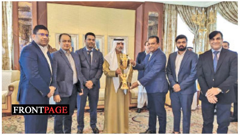 The President of Sri Lanka Cricket Shammi Silva (third from right) and the President of the Emirates Cricket Board, Sheikh Nahyan Bin Mubarak Al Nahyan who is also the Minister of Tolerance in UAE, posed for a photograph with the Men’s Asia Cup Trophy at launching ceremony in Dubai yesterday. Ashley De Silva, CEO of Sri Lanka Cricket, Thusith Perera, General Manager of the ACC, Mubashir Usmani, General Secretary of the ECB, Subhan Ahmad, Advisor to Emirates Cricket Board, and Prabhakaran Thanraj, Head of Events of ACC, are also in the picture. (Pic by SLC)