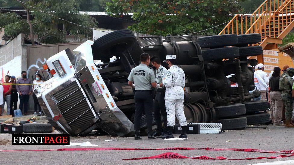 The truck was reportedly speeding when it flipped on a sharp bend and hit a pedestrian bridge on a main road leading to the Chiapas state capital Tuxtla Gutiérrez.