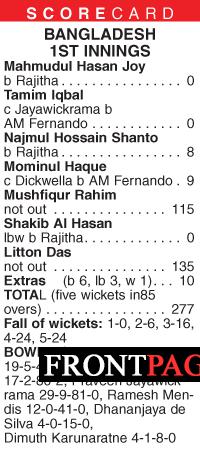At stumps, Bangladesh not only walked away relieved, they also were the happier side. From 24 for 5, having opted to bat in the second Test, they ended the opening day on 277 for 5 with twin centuries. Mushfiqur Rahim struck his second consecutive ton in the series, following his 105 in the high scoring draw in the opening Test with a 252-ball 115 while Litton Das this time around converted his start to a three-figure score to end with 135.