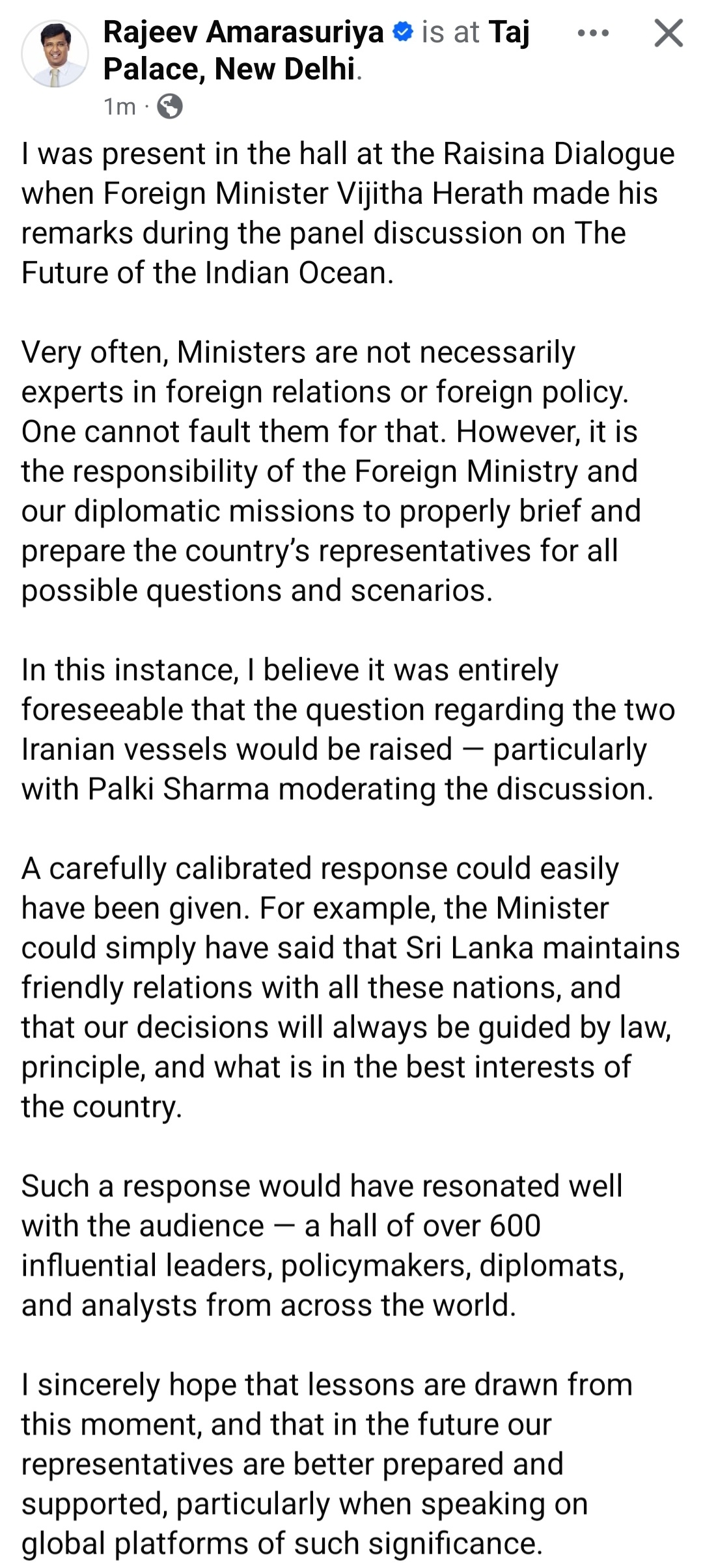 He added that a carefully calibrated response could have been given, suggesting the minister could have stated that Sri Lanka maintains friendly relations with all nations and that decisions would be guided by law, principle, and the country’s best interests.