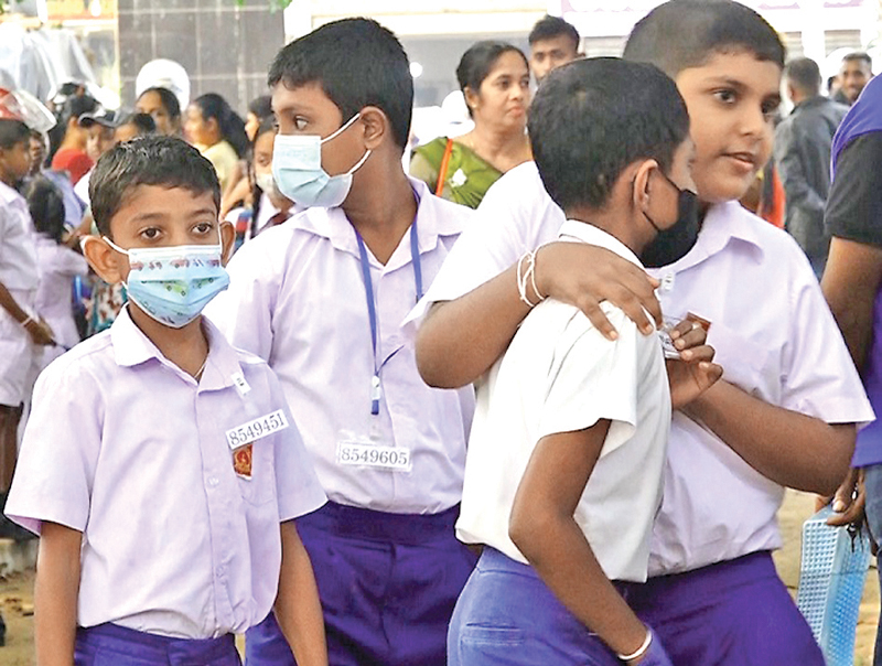 The year five scholarship exam was held yesterday at 2,894 centres countrywide. Altogether 334,698 students sat for the exam. Here, students from a school in Anuradhapura arriving at the school to sit for the exam. Picture by Thisara Samal in Anuradhapura.