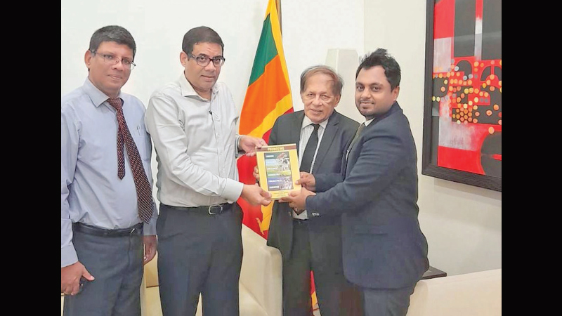 Presentation of the Volume 7 of ‘Promoting Employment Investment Tourism Education Agriculture and Foreign Policy’ book compiled by former Ambassador to Israel, Sarath Wijesinghe to Adviser to President, Dinesh Weerakody was held at the Finance Ministry recently. Chairman Blue Ocean Group, Thumilan Sivarajah, Chairman Surado Campus and Administrative Secretary to Ambassador Forum Sri Lanka P. S. Buddhika look on.