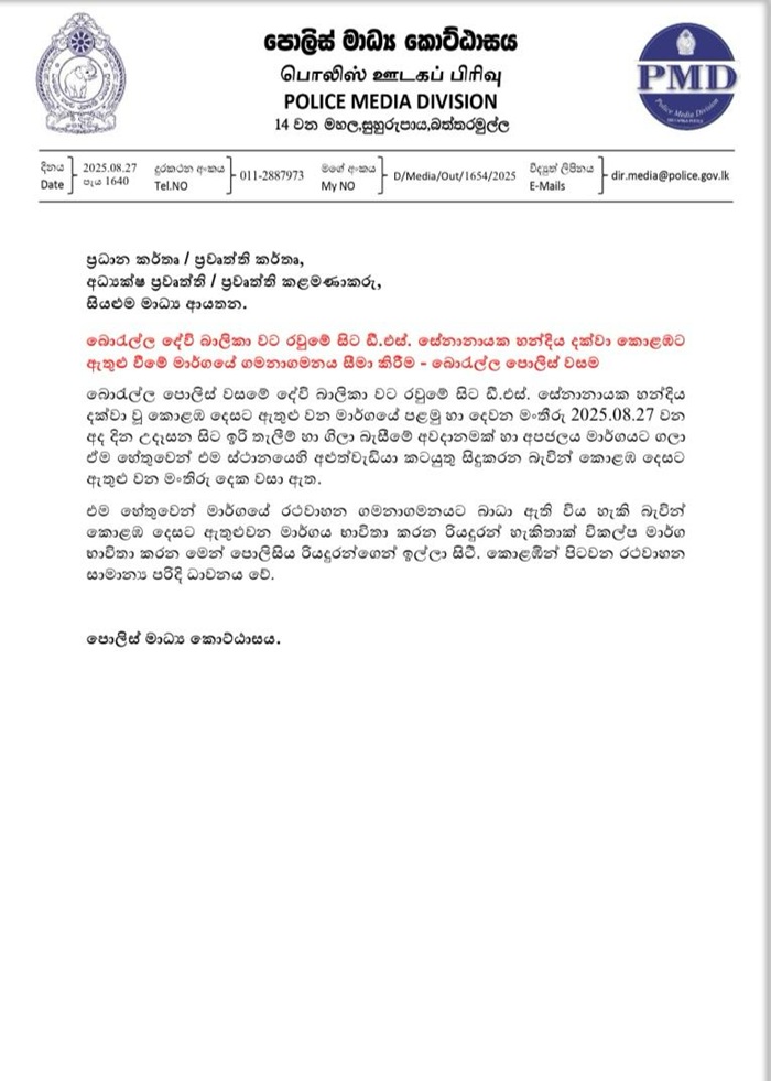 Borella sunken road : Police notice to motorists