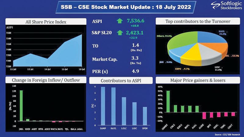 Sri Lanka Acting President Ranil Wickremesinghe has declared a state of emergency with effect from Monday July 18 in the interests of public security, the protection of public order and the maintenance of supplies and services essential to the life of the community.Thus, The All-Share Price Index increased by 68.8 points (+0.9%) to close at 7,536.6 for the day whilst S&P SL20 Index also gained by 22.9 points (+1.0%) to close at 2,423.1. Sampath Bank, Hayleys, LOLC Holdings, Lanka IOC and Aitken Spence remained as the top positive contributors to the ASPI during the day.