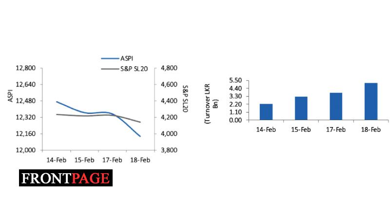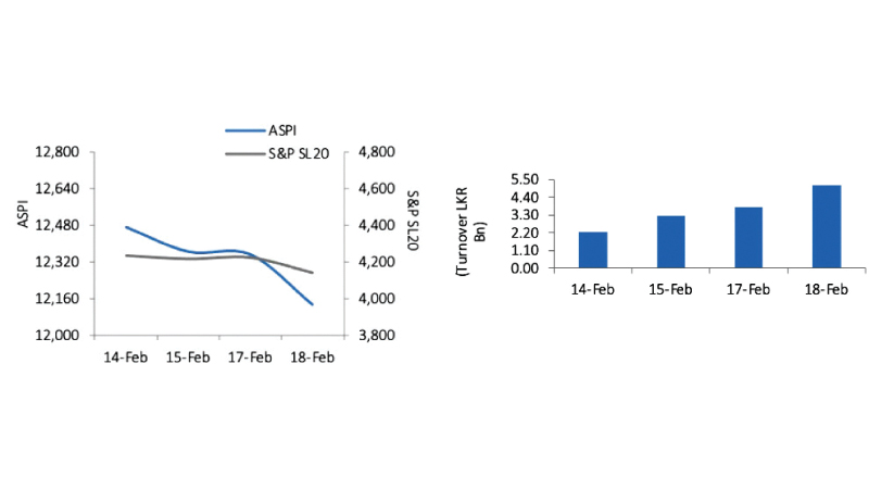 The Bourse ended the week on a negative note this week with ASPI decreasing by 325.76 points (or 2.61%) to close at 12,134.04 points, while the S&P SL20 Index also decreased by 78.77 points (or 1.87%) to close at 4,140.65 points.