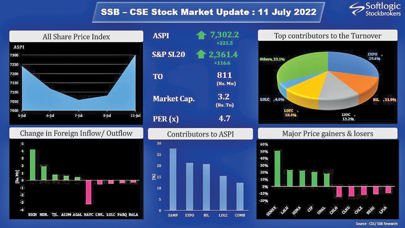 Thus, the All-Share Price Index Increased by 221.5points (+3.1%) to close at 7,302.2for the day whilst S&P SL20 Index also gained by 116.6 points (+5.2%) to close at 2,361.4.