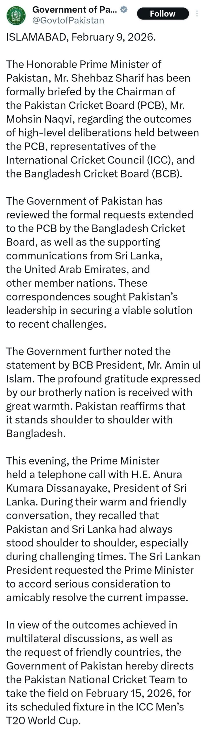 Pakistan will play the India–Pakistan T20 World Cup match on February 15, following consultations with the ICC, PCB and BCB, and requests from Sri Lanka and other friendly nations.