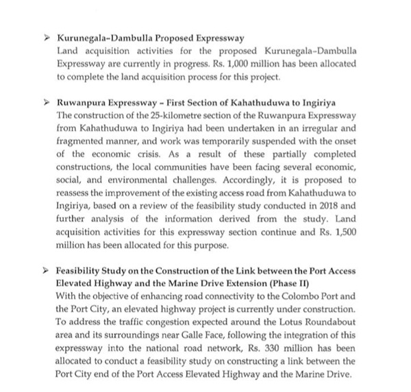 The construction of the Pihtuhera- Rambukkana section of the Central Expressway Phase 3 from Pothuhera- Galagedera is slated to be completed in the first quarter of 2027. The government has allocated Rs. 10,500 million for this purpose.