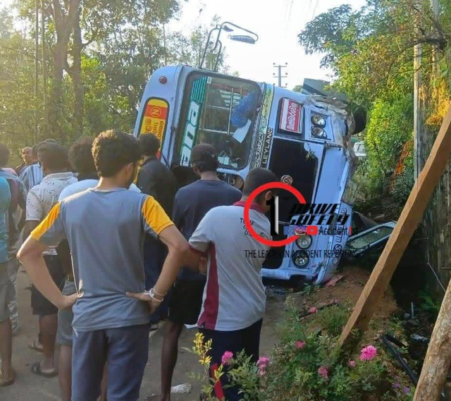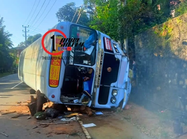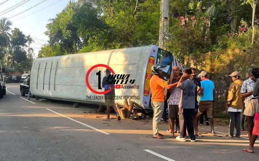 A private passenger bus traveling from Colombo to Welimada veered off the road and crashed into a rock before overturning across the roadway early this morning (18) in the Nayamadiththa area of Uva Thenna, Haldummulla.