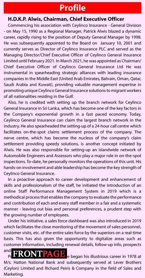 Since its inception, Ceylinco General Insurance has been an innovator and trend-setter in the insurance industry. Being the market leader in the general and life insurance industries, the Company reported a premium income of Rs 20.2 billion in general insurance alone in 2021, a reasonable growth of 0.6% against 2020 premium income, despite multiple challenges. Enjoying approximately over 20 % of the insurance market share and having 554 branches spread across the island, Ceylinco Insurance General’s Chairman, CEO Patrick Alwis, sat down with the Daily News to share his perceptions on the industry and his Company’s strategies.
