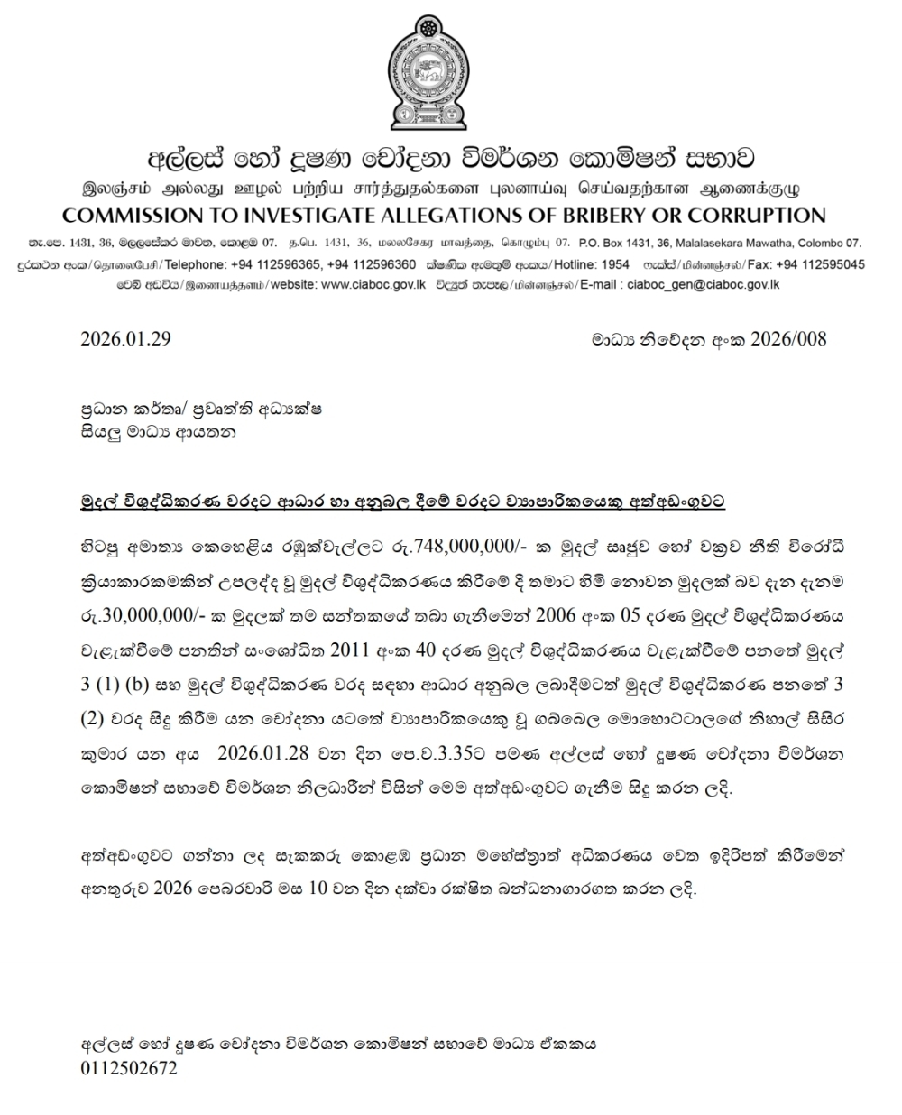 The suspect is accused of knowingly possessing Rs. 30 million believed to be part of funds laundered in connection with former Minister Keheliya Rambukwella, who is alleged to have directly or indirectly acquired Rs. 748 million through unlawful activities.